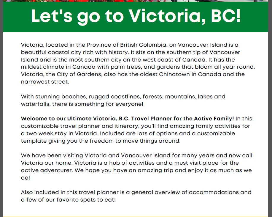 With this customizable travel planner and itinerary, you’ll find amazing family activities for a two-week stay in Victoria BC, Canada. Included are lots of options and a customizable template giving you the freedom to move things around. We have been visiting Victoria and Vancouver Island for many years and now call Victoria our home. Victoria is a hub of activities and a must-visit place for the active adventurers. We hope you have an amazing trip and enjoy it as much as we do!